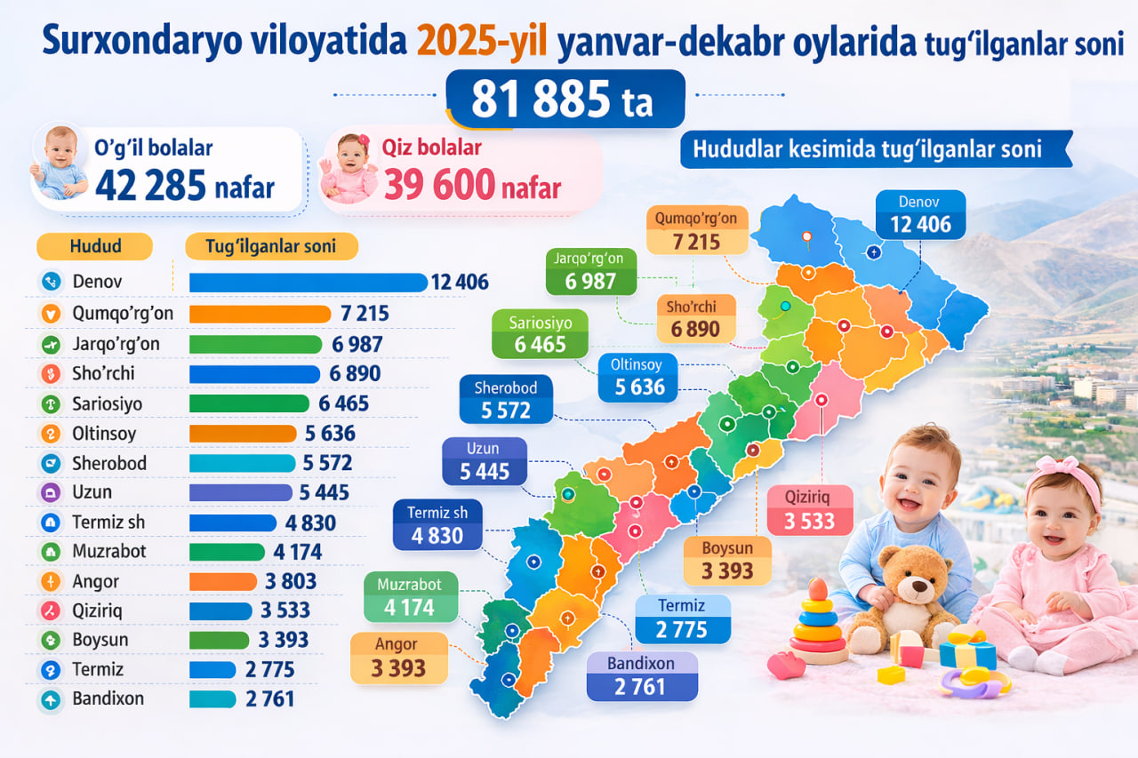 2025-yilning yanvar-dekabr oylarida Surxondaryo viloyatida 81 885 ta tug‘ilganlar qayd etilgan.