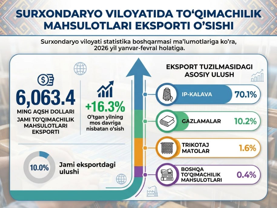 Surxondaryo viloyati statistika boshqarmasi ma’lumotlariga ko‘ra, 2026-yilning yanvar–fevral oylari yakuni bo‘yicha viloyatda jami 6 063,4 ming AQSH dollarilik to‘qimachilik mahsulotlari eksporti amalga oshirildi.