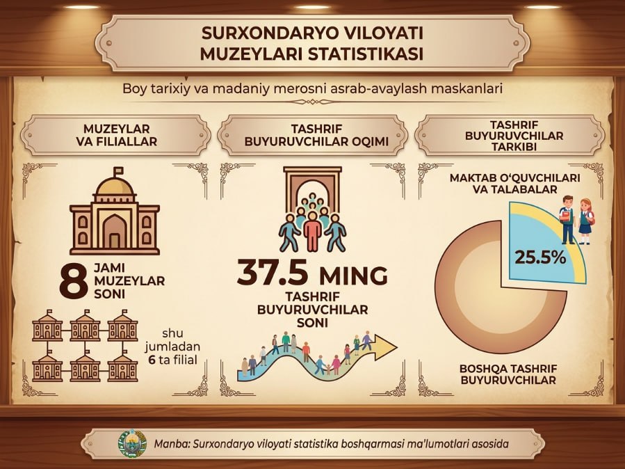 Muzeylarga tashrif buyuruvchilar soni 37,5 ming kishini tashkil etgan bo‘lib, ularning 25,5 foizi o‘quvchi va talabalar hissasiga to‘g‘ri keladi.