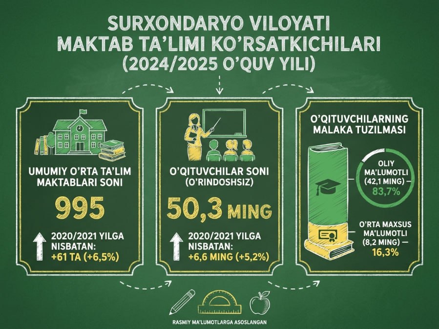 2024/2025-o‘quv yili boshiga Surxondaryo viloyatida jami 995 ta umumiy o‘rta ta’lim maktabi faoliyat yuritmoqda. Bu 2020/2021-o‘quv yiliga nisbatan 61 taga ko‘p bo‘lib, 6,5 foiz o‘sishni tashkil etdi.