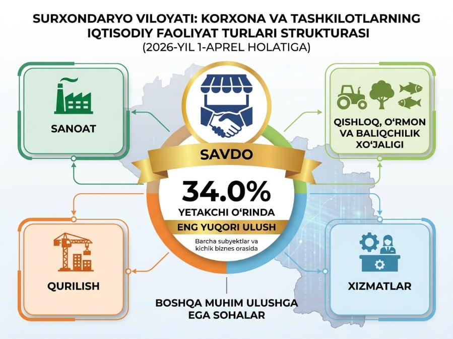 2026-yil 1-aprel holatiga ko‘ra, iqtisodiy faoliyat turlari bo‘yicha faoliyat yuritayotgan korxona va tashkilotlar tarkibida “Savdo” tarmog‘i yetakchi o‘rinni egallab turibdi.