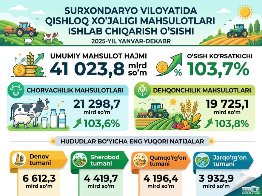 2025-yil yanvar-dekabr oylarida viloyatda qishloq xo‘jaligi mahsulotlari yetishtirish hajmi 41 023,8 mlrd so‘mni tashkil etdi.